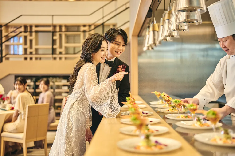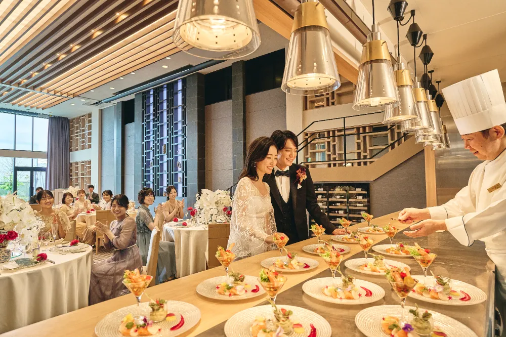木をふんだんに使ったパーティ会場内は高い天井にピアノとヴァイオリンの調べが心地よく響く。 オープンキッチンでは絶好のタイミングで料理を提供。シェフのパフォーマンスをご覧いただきながらゲストへのサプライズにも手を抜かない。