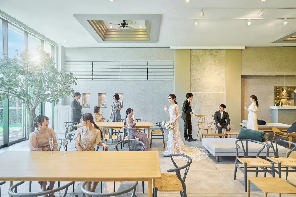 挙式~パーティを緩やかに繋ぐアルジェントの新提案「アペリティフパーティ」。専用のロビーには北欧家具を中心に評価の高いアイテムをさりげなく設える。フィンガーフード片手にボサノヴァの生演奏が織りなすライブ感を楽しむことができる。