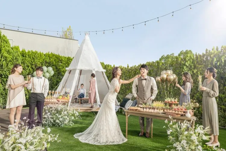 会場の奥に広がるのは屋内外を行き来する事ができる「アウトドアテラス」。ティピテントやグランピンググッズで、従来の結婚式では体験したことのない期待感を邸宅カルサダでお届けします。