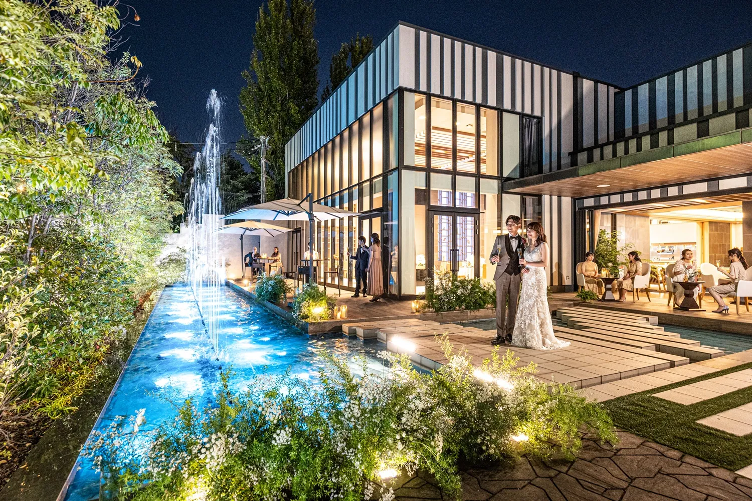 パーティが進むにつれて一層幻想さを増すナイトタイムの邸宅レガーレ。テラスはイルミネーションや花火で彩られ、上品でありながらも華やかな雰囲気が記憶に残るウエディングとなる。全天候型だから館内から美しいライトアップショーを楽しむことができる。
