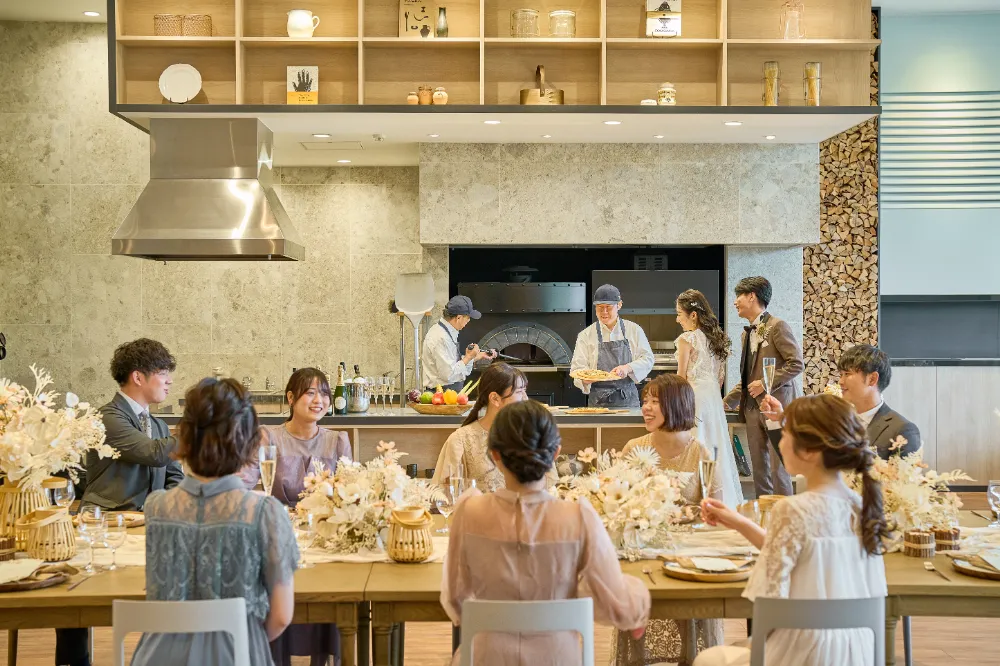 80名まで収容できる石窯付きのアイランドキッチン。石窯グリルで焼き上げられる出来立てアツアツのピザやローストビーフなどをゲストにおもてなし。