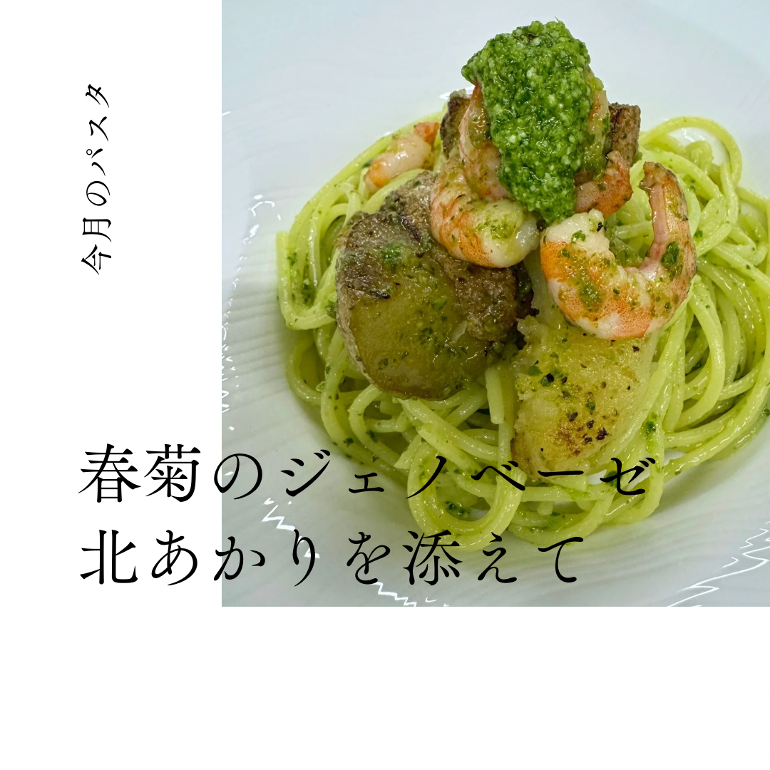 春菊の香りをぎゅっと閉じ込めた、ちょっと珍しいジェノベーゼパスタ。